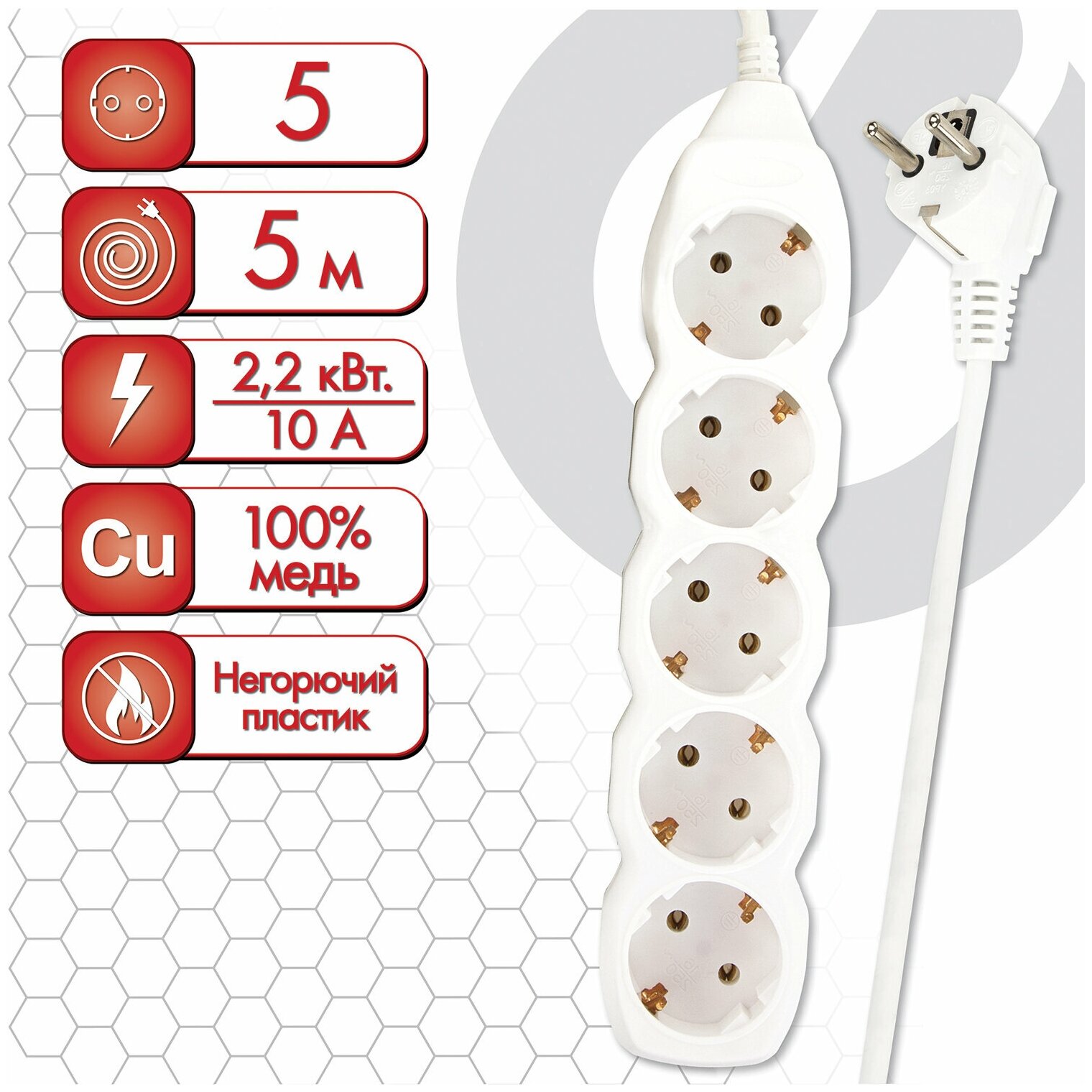 Удлинитель сетевой Sonnen U-155G, 5 розеток, c заземлением, 10 А, 5 м, белый (511437)