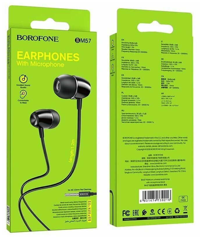 Проводные наушники BOROFONE BM57 Platinum, Jack 3.5mm, 1.2 м, черный, контроллер с микрофоном