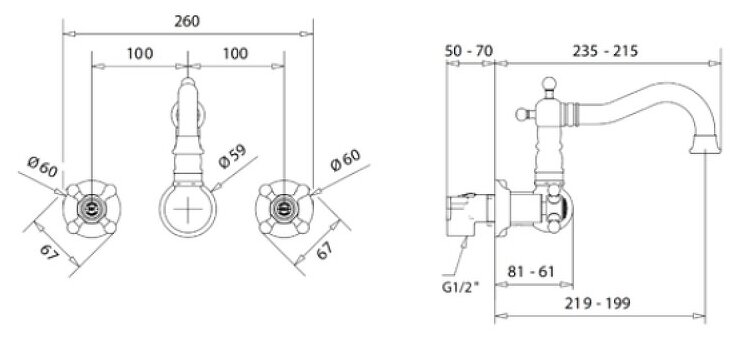 Смеситель на раковину настенный Эверест B46-350 с круглым поворотным изливом, кран-буксы 1/2", хром