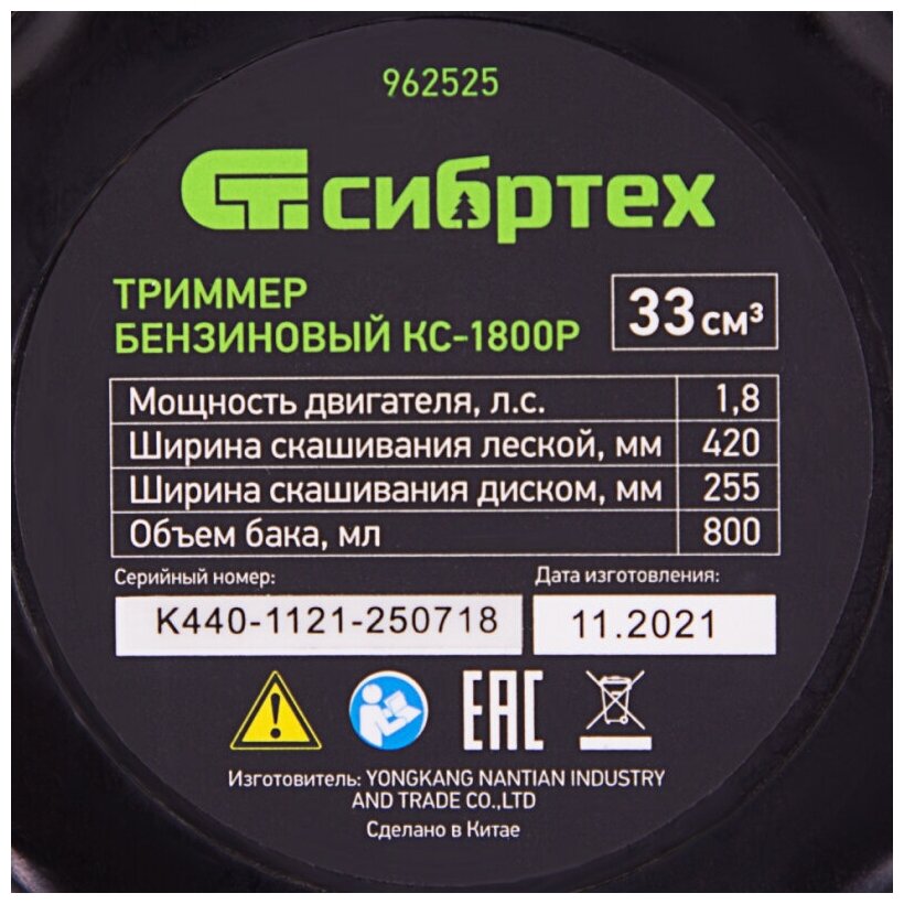 Триммер бензиновый КС-1800Р, 33 см3, разъемная штанга, состоит из 2 частей Сибртех 962525 информация: