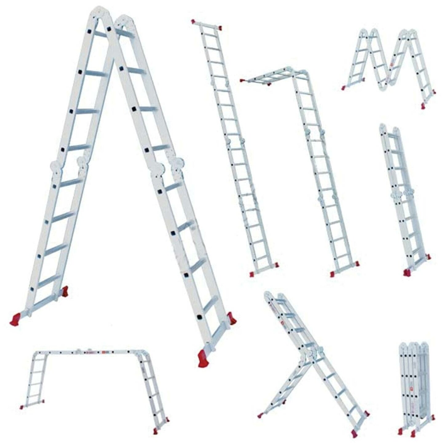 10 цен на Лестница-трансформер алюминиевая 4х4 ступени, высота 4,5 м (4 секции по 1,2 м) до 150 кг, вес 16,5 кг, новая высота