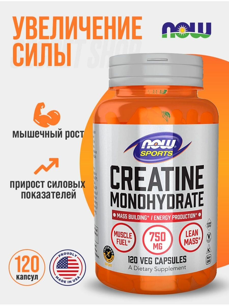 Креатин моногидрат NOW FOODS Creatine 750 mg 120 веган капсул информация: