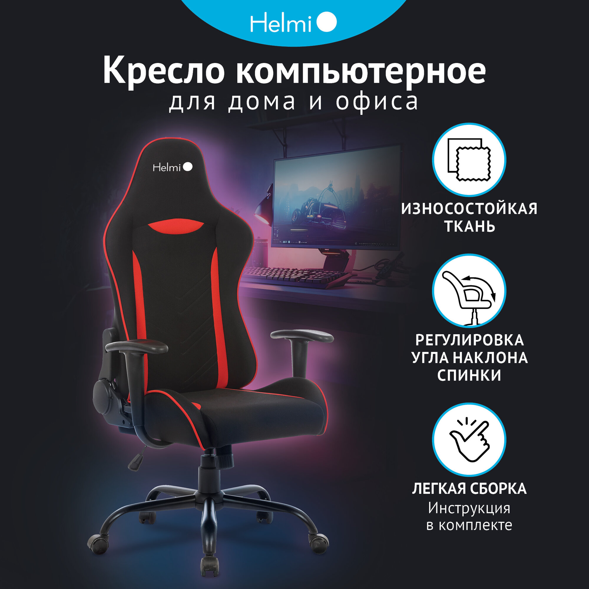 Кресло игровое HELMI Winner, на колесиках, ткань, черныйкрасный [306177] информация:
