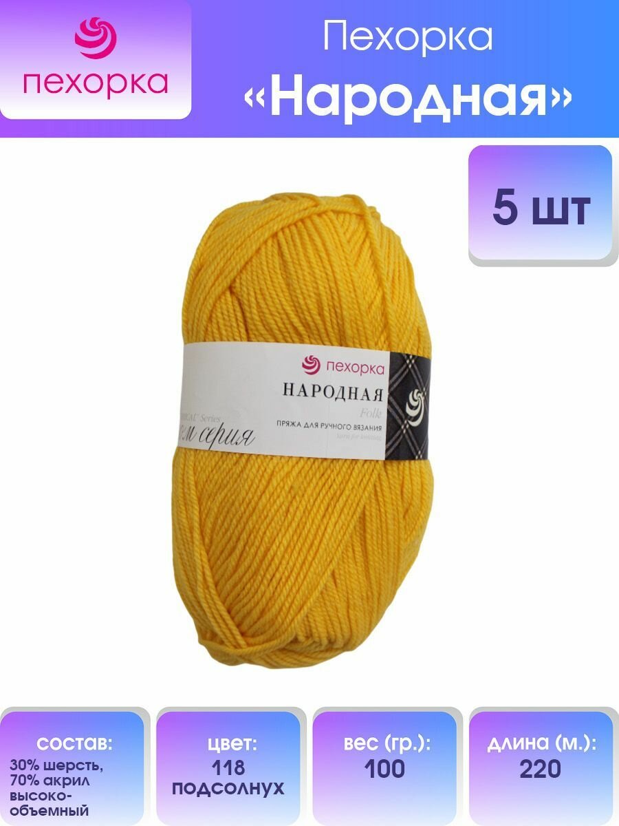 Пряжа Пехорка Народная подсолнух (118), 70%акрил/30%шерсть, 220м, 100г, 5шт