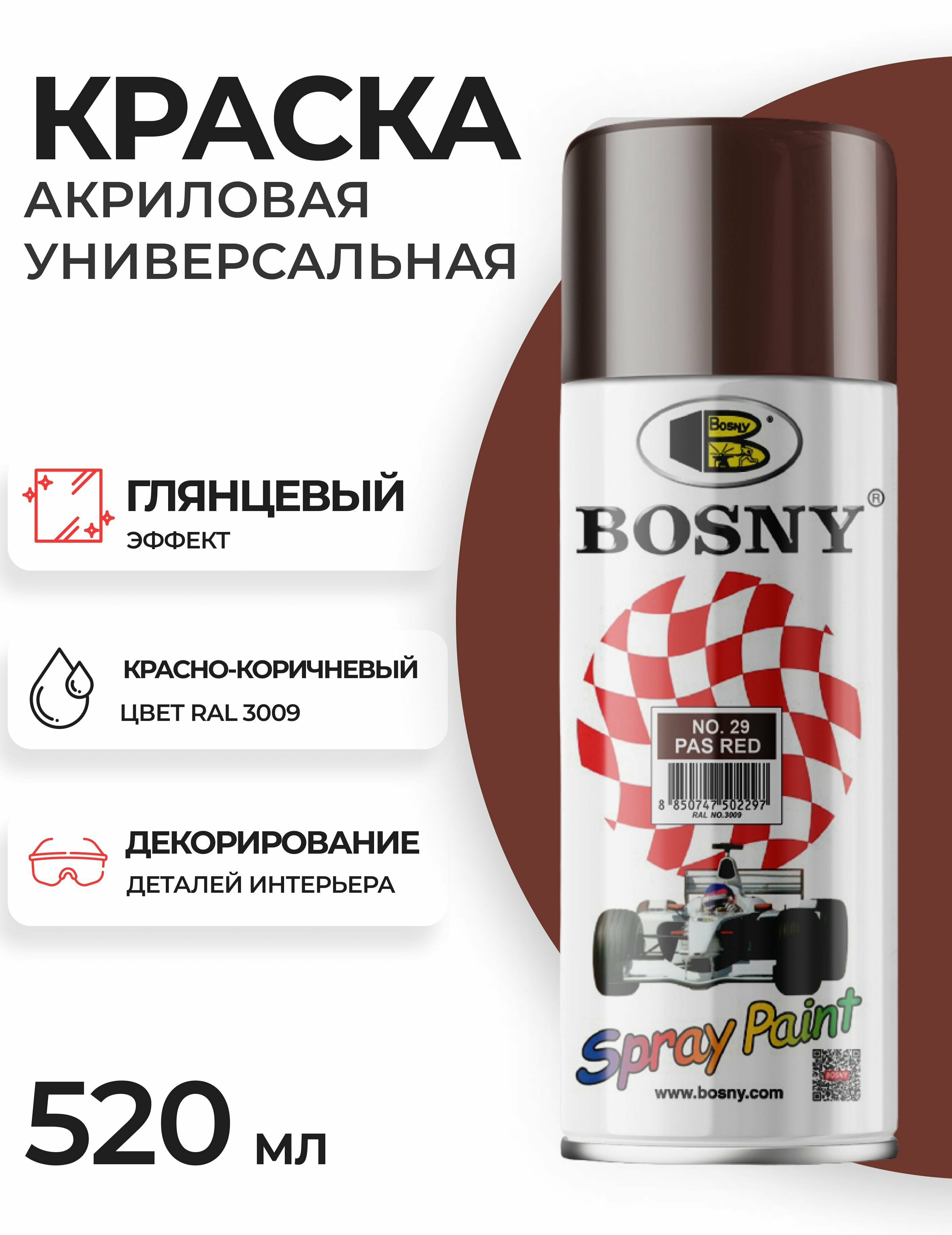 Аэрозольная краска в баллончике Bosny №29 акриловая универсальная, цвет красно-коричневый, RAL 3009 (BOSNY NO. 29), 520 мл информация: