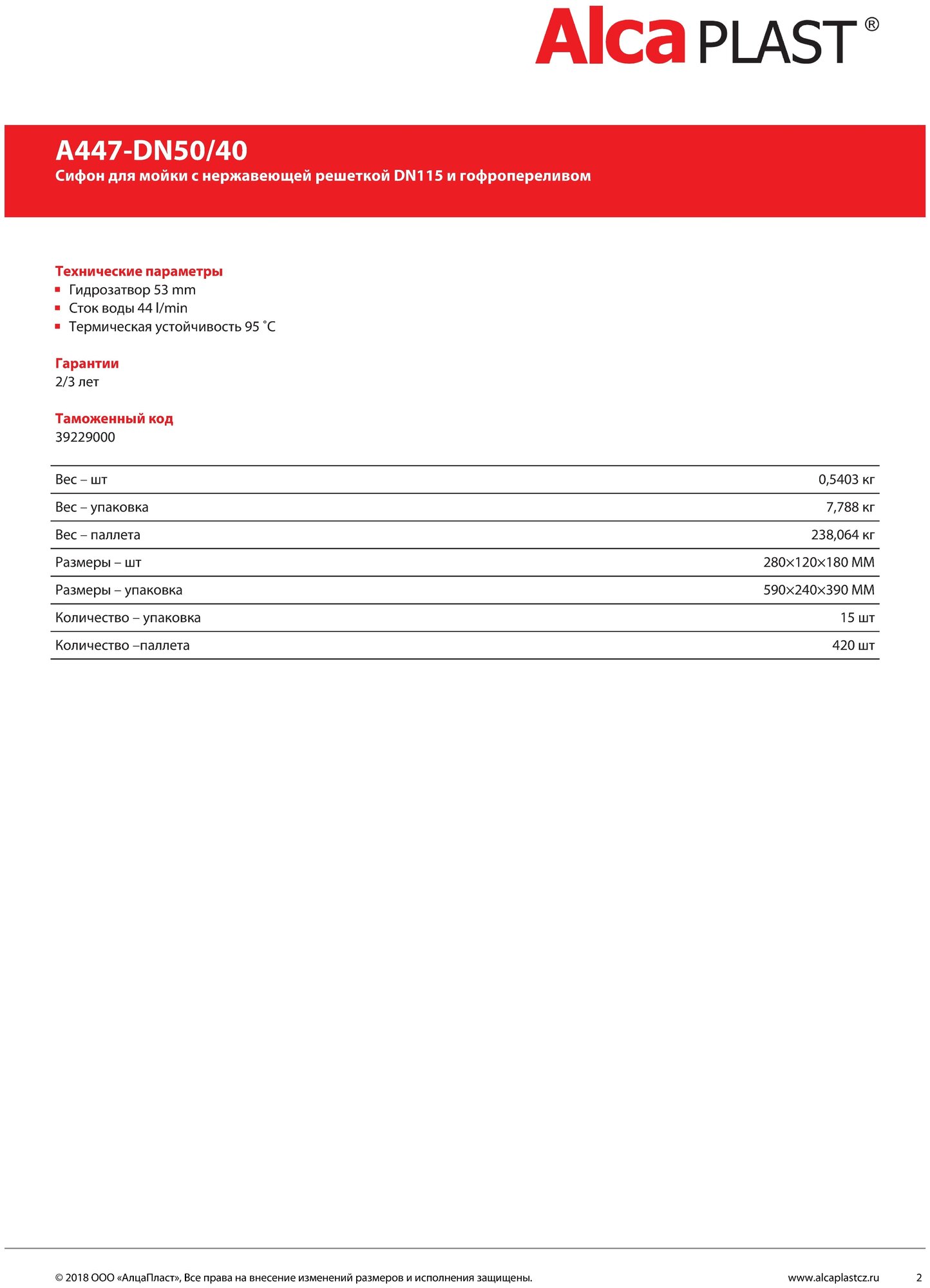 AlcaPlast Сифон для кухонной Мойки AlcaPlast A447-DN50/40 белый информация: