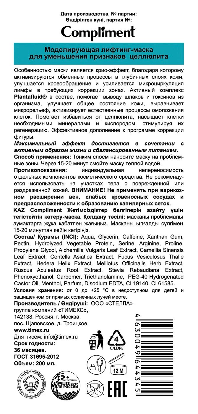 Лифтинг-маска для тела Compliment для уменьшения признаков целлюлита, 200 мл