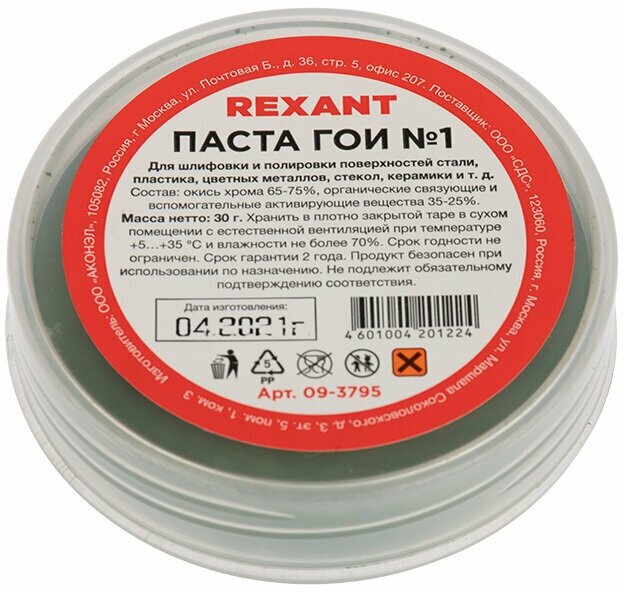 Полировальная паста ГОИ № 3 REXANT для средней шлифовки и полировки поверхностей, банка 30 грамм 248 ₽