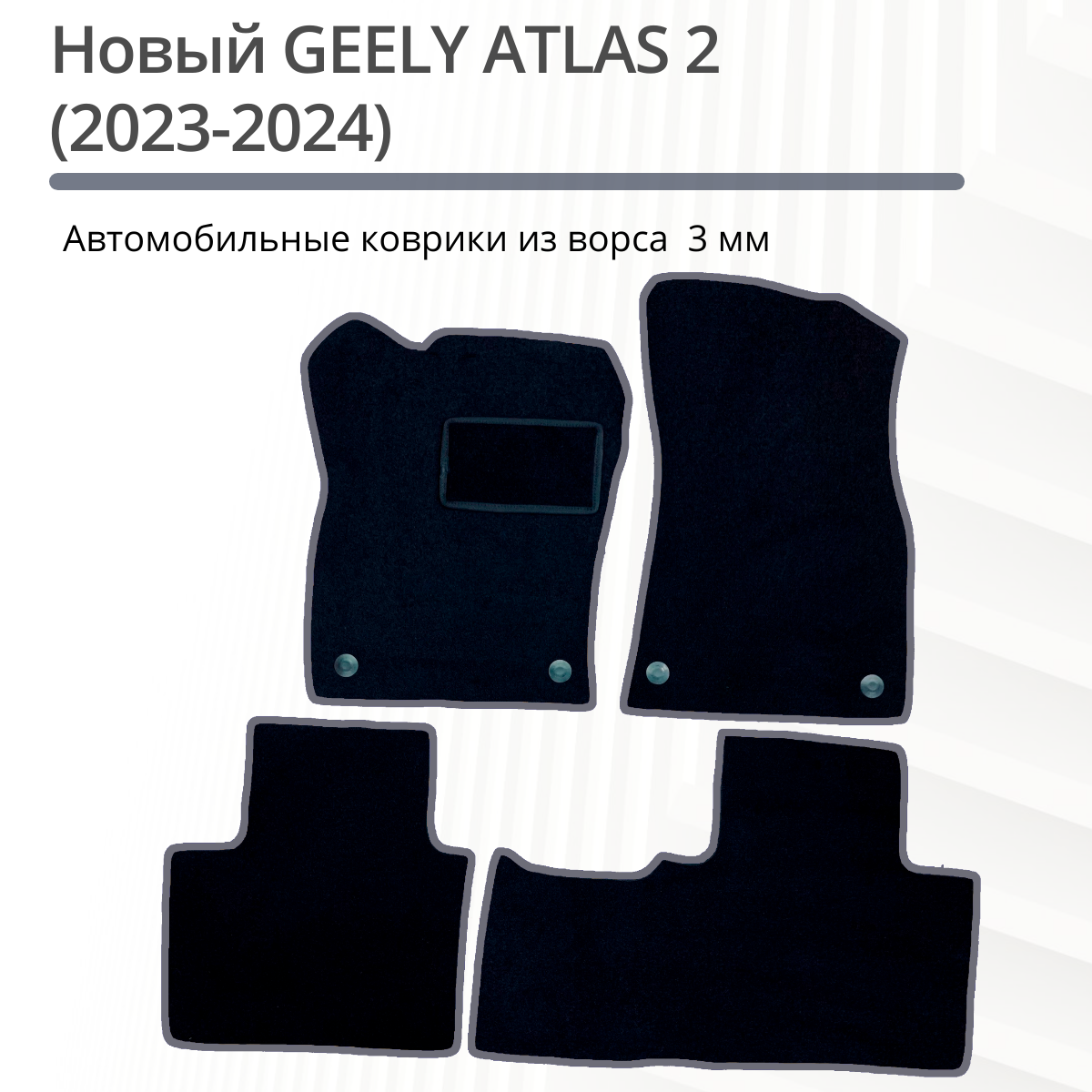 Ворсовые коврики для Новый GEELY ATLAS 2 (2023-2024) / передний привод / Джили Атлас 2 / Черные с серым кантом / Комплект 4 шт. информация: