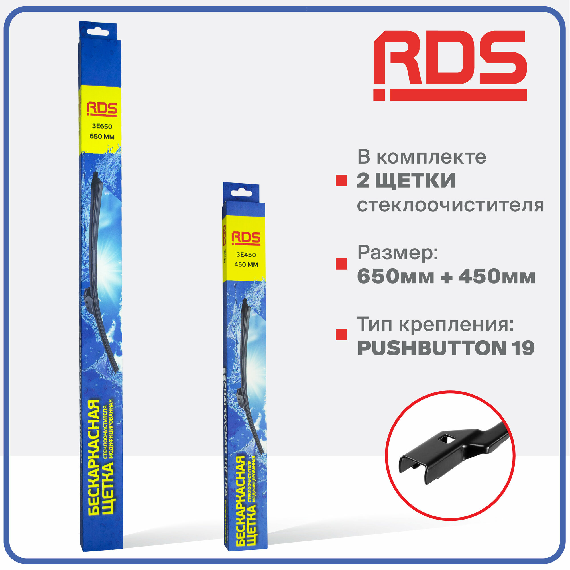 | Подробная комплектация | Комплект автомобильных дворников - 2 щетки стеклоочистителей с креплением PushButton19 |