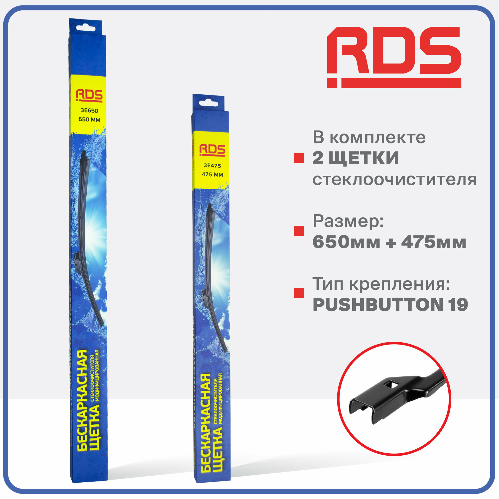 | Подробная комплектация | Комплект автомобильных дворников - 2 щетки стеклоочистителей с креплением PushButton19 |