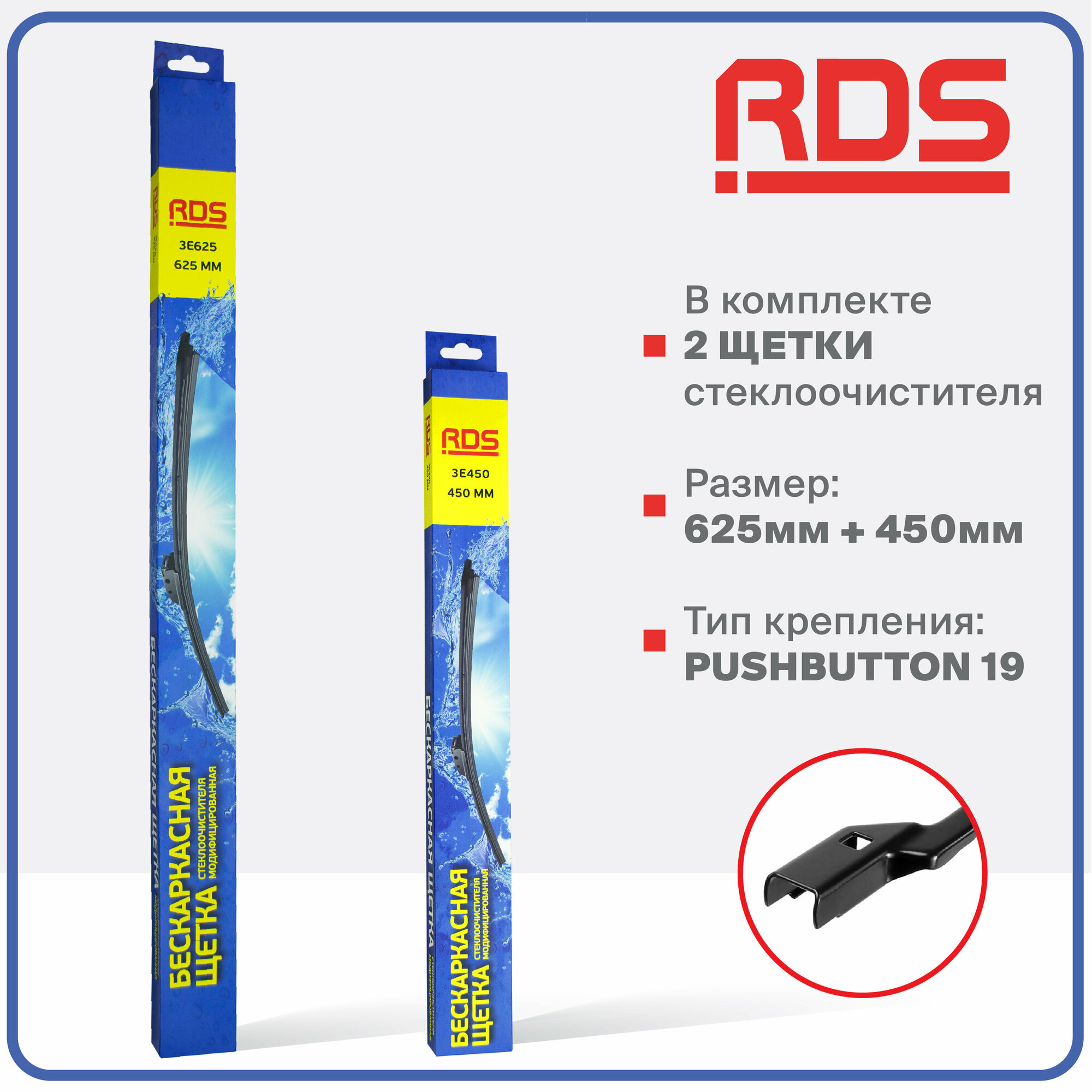 | Подробная комплектация | Комплект автомобильных дворников - 2 щетки стеклоочистителей с креплением PushButton19 |