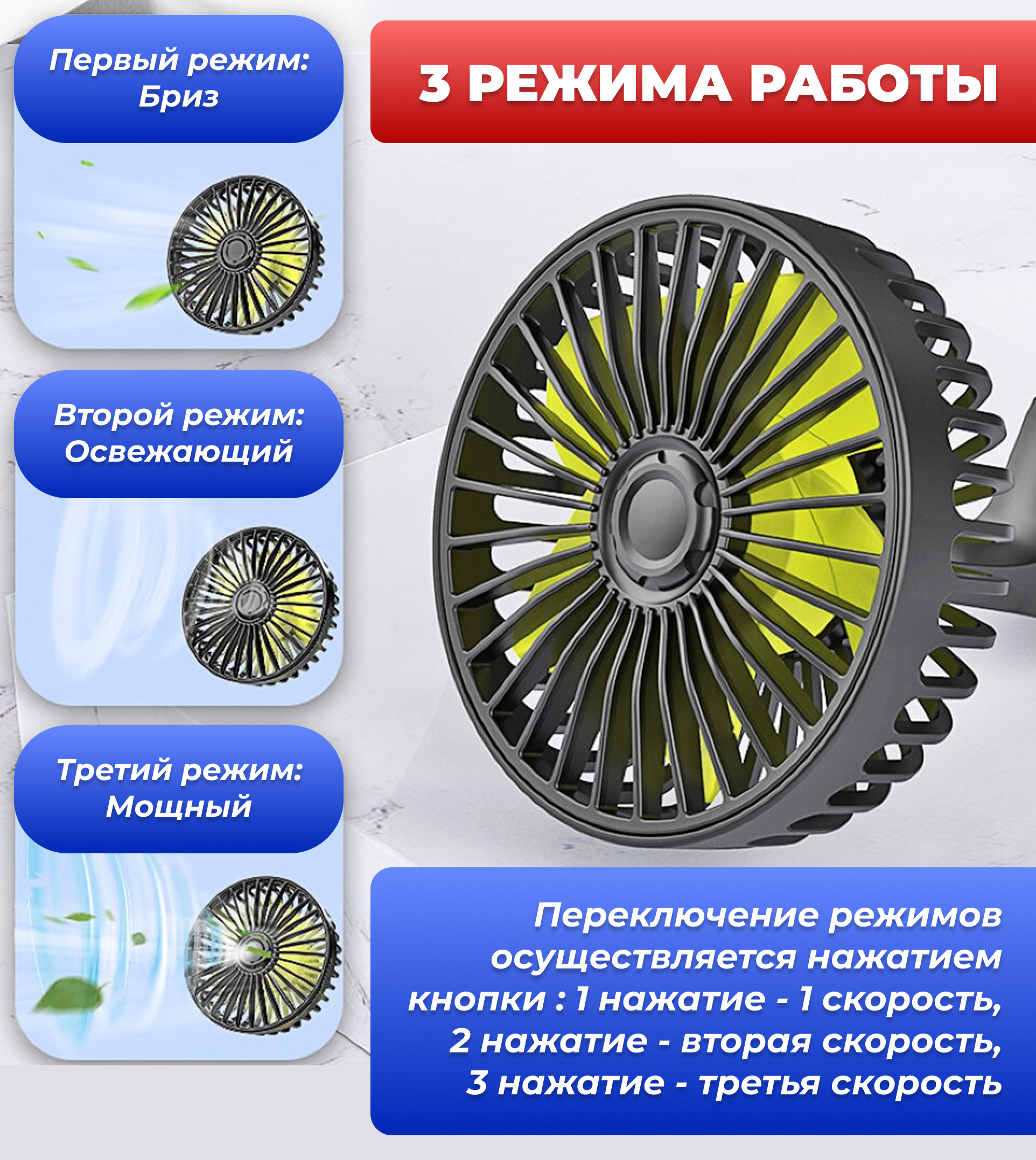 Автомобильный USB-вентилятор, 3 режима работы, 10w, на присоске информация: