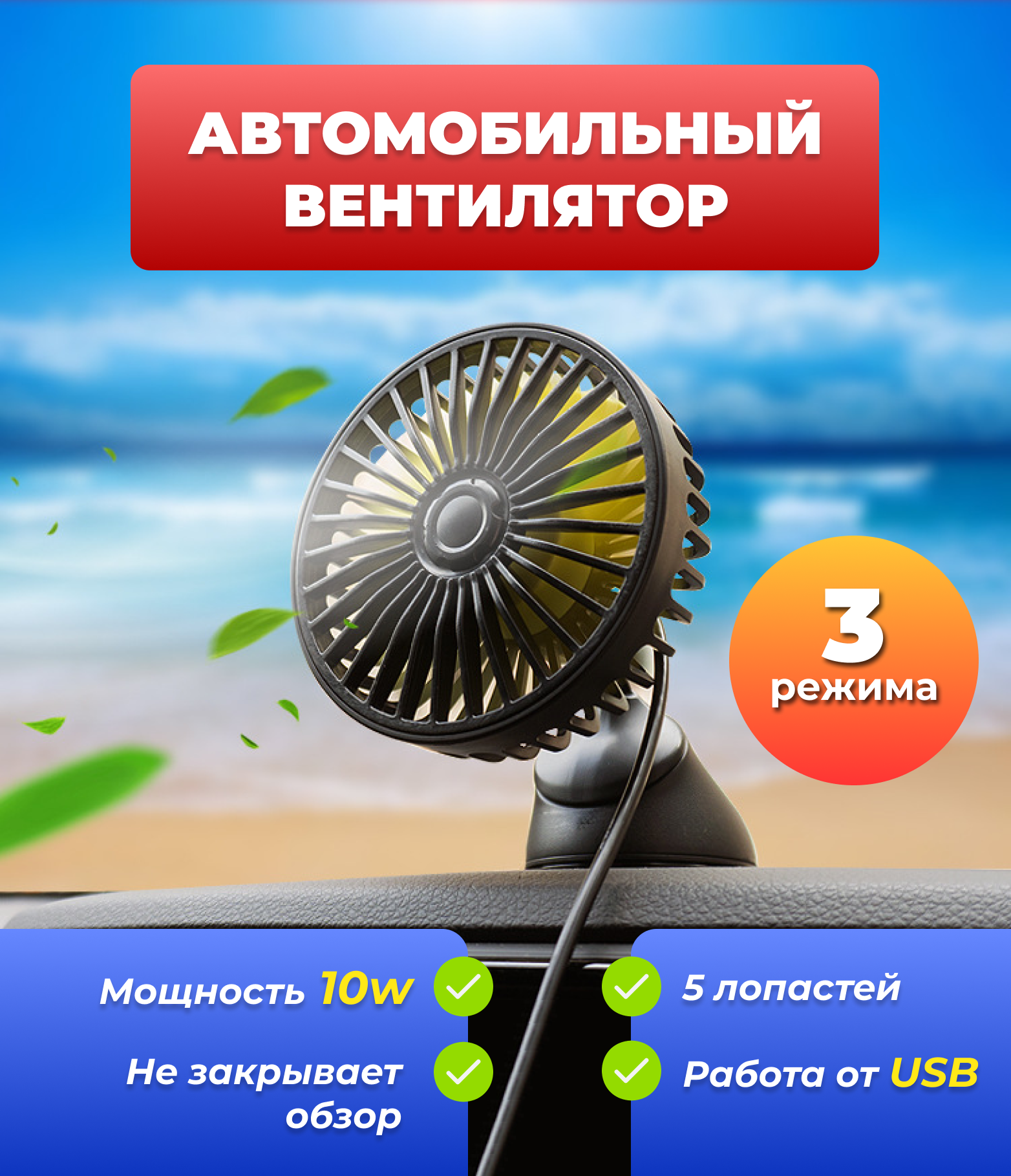 10 цен на Автомобильный USB-вентилятор, 3 режима работы, 10w, на присоске