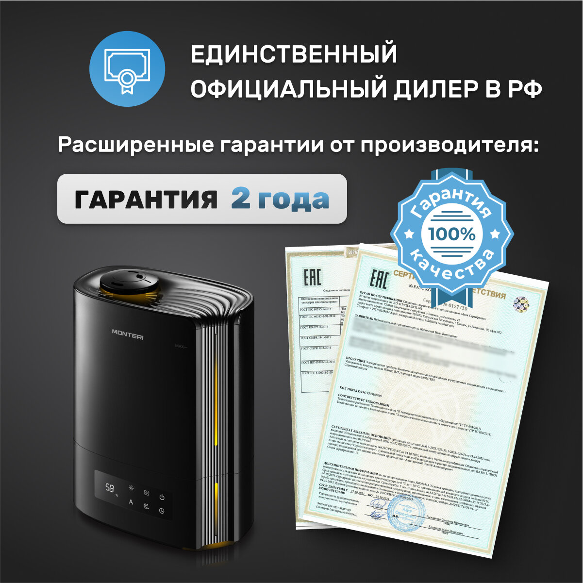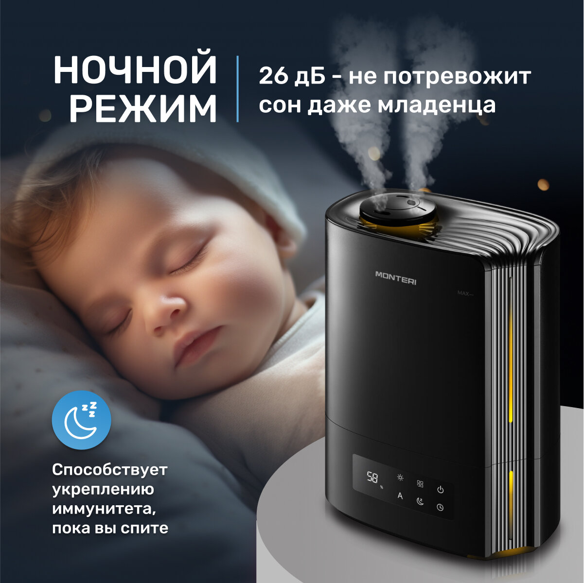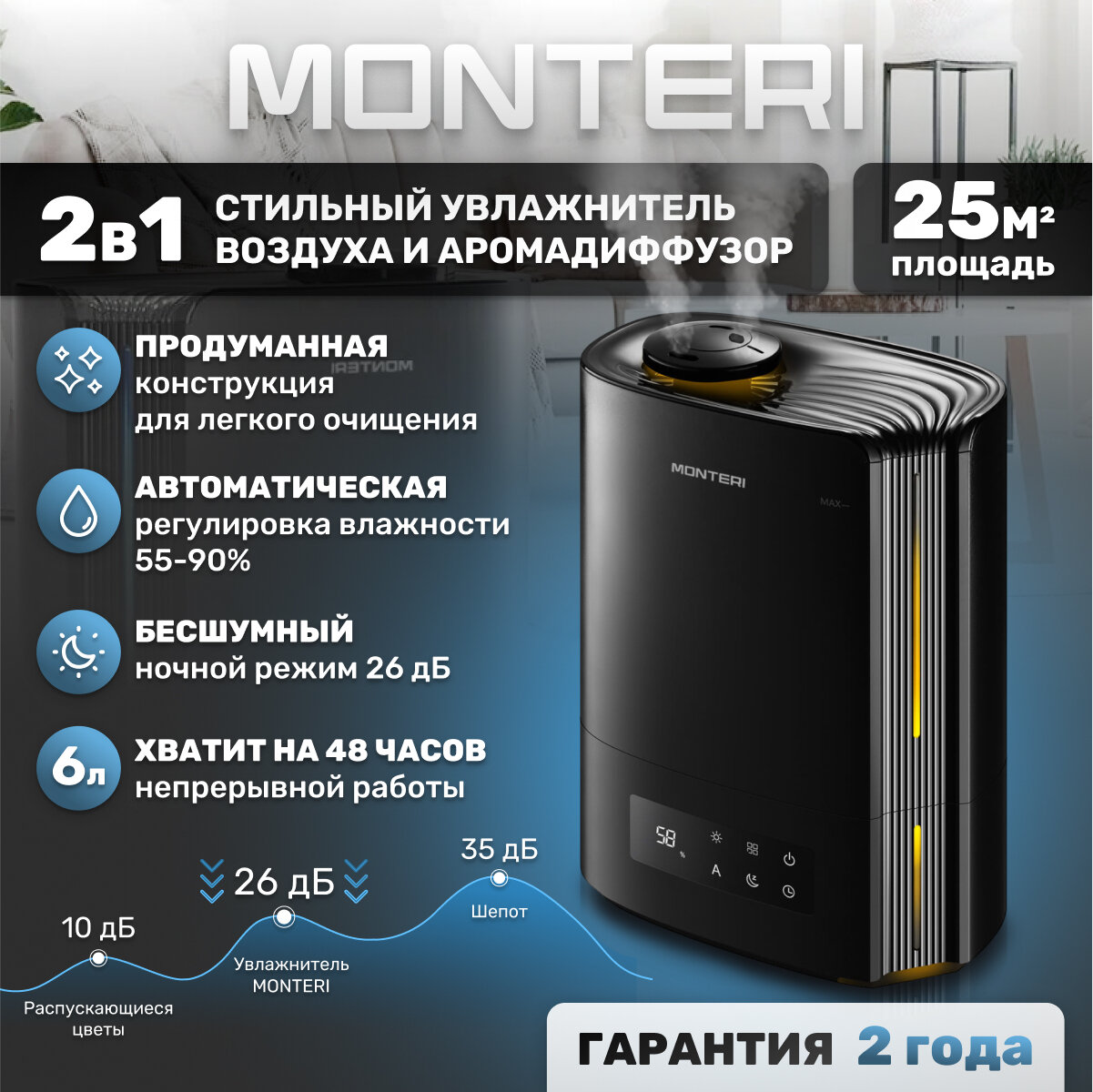 Увлажнитель воздуха для дома с аромадиффузором MONTERI Wasser B25, черный с подсветкой, ультразвуковой воздухоувлажнитель с верхним заливом, тихий пароувлажнитель в детскую комнату информация: