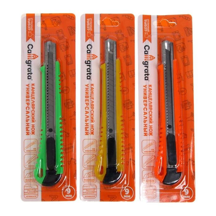 Отзывы на Нож канцелярский, лезвие 9 мм, с металлическим направляющим фиксатором, блистер, корпус микс, 3 штуки