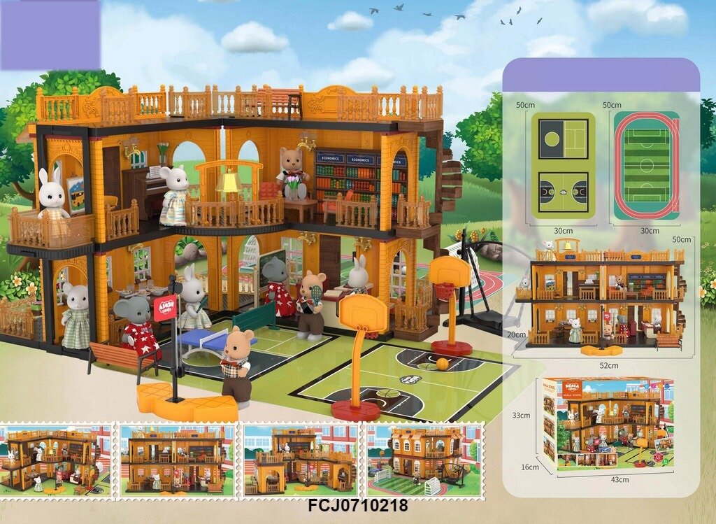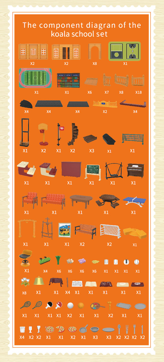 | Комплектация | стена - 4 шт, дверь - 8 шт, детская площадка - 1 шт, футбольное поле - 1 шт, книжная полка - 1 шт, забор - 35 шт, крыша - 8 шт, баскетбольная стойка - 2 шт, стойка для поднятия флага - 1 шт, лестница - 2 шт, перегородка - 1 шт, учебный стол - 2 шт, подиум - 1 шт, письменная доска - 1 шт, качели - 1 шт, пианино - 1 шт, кресло-диван - 2 шт, стол - 2 шт, стол для настольного тенниса - 1 шт, стойка для чертежной доски - 1 шт, фоторамка - 1 шт, стул - 2 шт, футбольная сетка - 2 шт, вращающийся стул - 1 шт, трава - 10 шт, цветы - 18 шт, люстра - 8 шт, колокольчик - 1 шт, стол - 1 шт, ручка - 4 шт, тетрадь - 3 шт, пенал - 2 шт, ракетка для бадминтона - 2 шт, ракетка для настольного тенниса - 2 шт, мяч для настольного тенниса - 2 шт, мяч для баскетбола - 1 шт, краски - 1 шт, разделочная доска - 1 шт, тарелка - 4 шт, чашка - 8 шт, пицца - 4 шт, сковорода - 1 шт, миска - 3 шт, ложка - 2 шт, зажим - 2 шт, вилка - 2 шт, нож - 2 шт, аксессуары - 27 шт. |