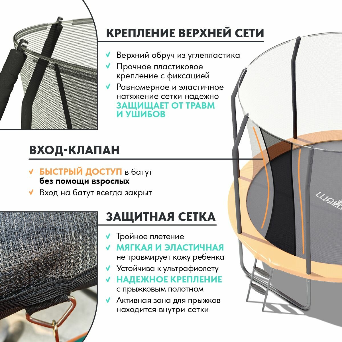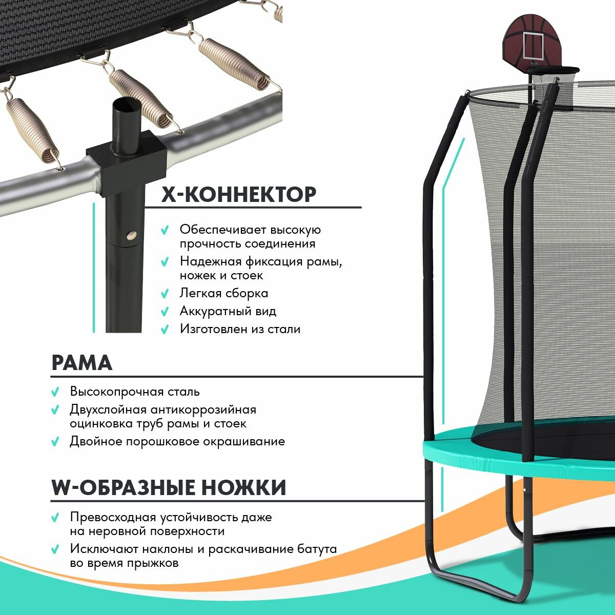 | Особенности | W-образные опоры / баскетбольное кольцо / защита пружин / нижняя защитная сетка / с защитной сеткой / с лестницей |
