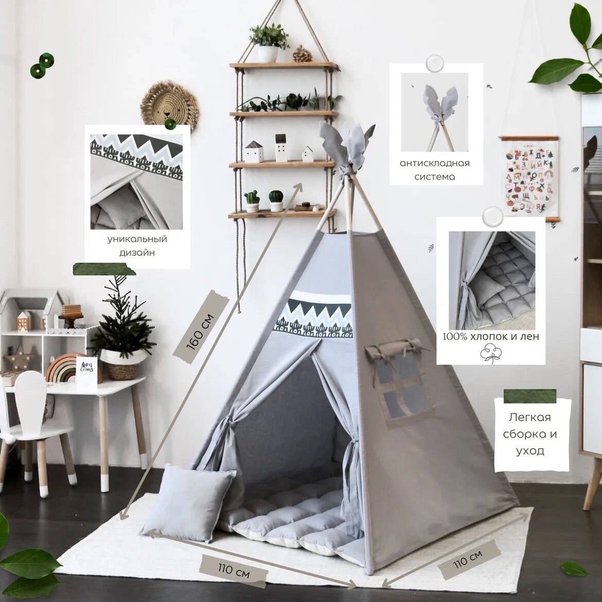 Вигвам детский игровой домик серый льняной с ковриком информация: