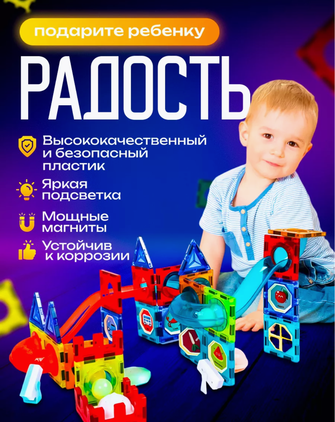 Дополнительная информация | з варианта подсветки, светящиеся шарики, поворотный прожектор, волшебный фонарик, сверхсильные магниты, фигурки не распадаются |