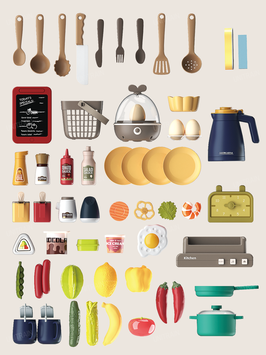 | Комплектация | 63 предмета: 9 столовых предметов (ложка для спагетти / лопатка / половник / шумовка / разделочный нож / обеденный нож / 2 ложки / вилка) / чайник / чашки / сковорода / кастрюля с крышкой / 4 тарелки / корзинка для продуктов / баночки и бутылочки для соуса / продуты: салат / морковь / перец / яичница / 3 яйца / сосиски / креветка / огурец / банан / помидор и др. Некоторые продукты на липучках / их можно разрезать игрушечным ножом |