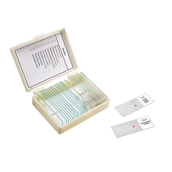 | Комплектация | Образцы – 11 шт Предметные стекла – 12 шт Покровные стекла – 20 шт Пластиковый кейс |