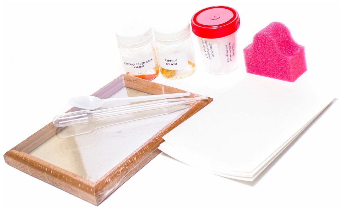 | Комплектация | цитрат аммония, хлорное железо, гексацианоферрат калия, стаканчик мерный, чайная ложка, пипетка Пастера, акварельная бумага, рамка, губка, перчатки инструкция |