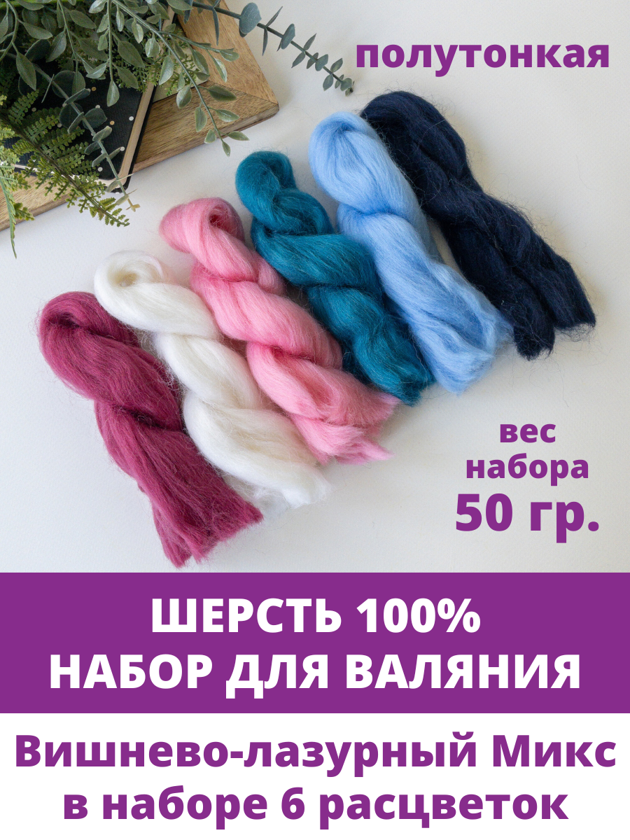 10 цен на Шерсть для валяния, вишнево-лазурный микс, полутонкая шерсть 100 %, набор 6 цветов, 50 г