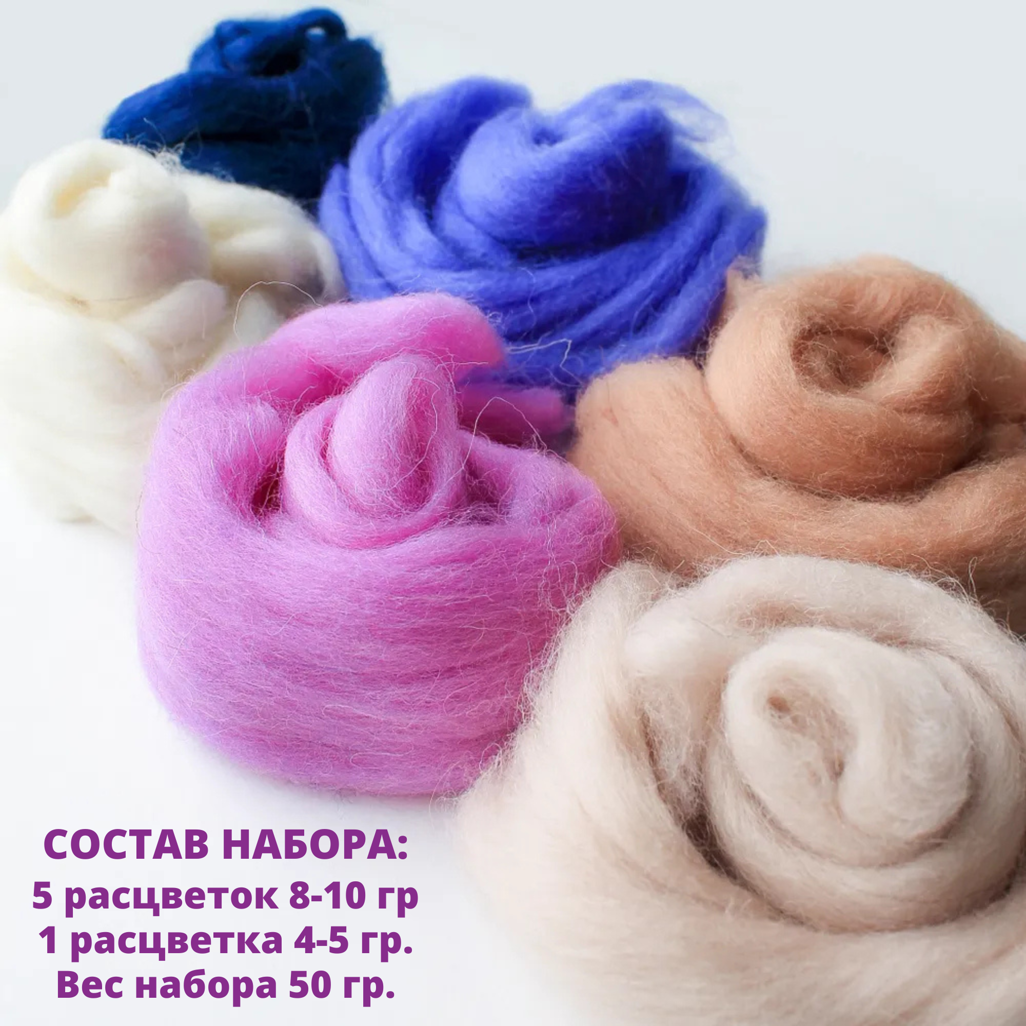 Шерсть для валяния, Фиолетовый микс, полутонкая шерсть 100 %, набор 5 цветов, 50 г 467 ₽