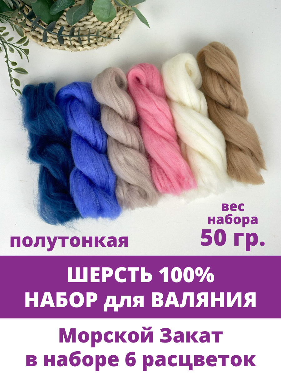 Шерсть для валяния, микс Морской закат, полутонкая шерсть 100 %, набор 6 цветов, 50 г информация: