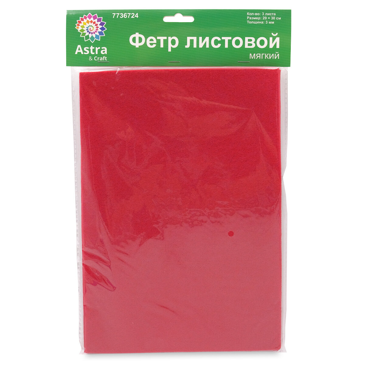 Набор мягкого фетра "Астра" (3 шт) ярко-красный, 3 мм, 400 гр. 20х30 см информация: