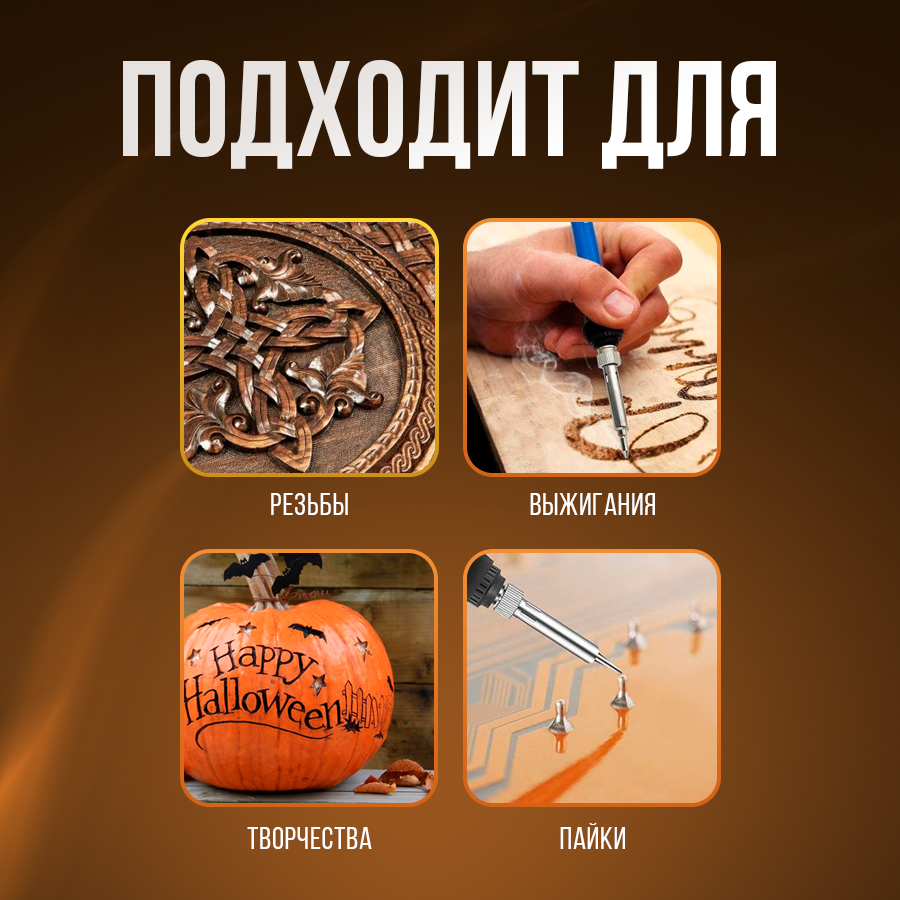 | В комплекте | выжигательный аппарат, доска для выжигания, заготовка для резьбы, подставка, резцы по дереву, сменные насадки, трафаретная доска |