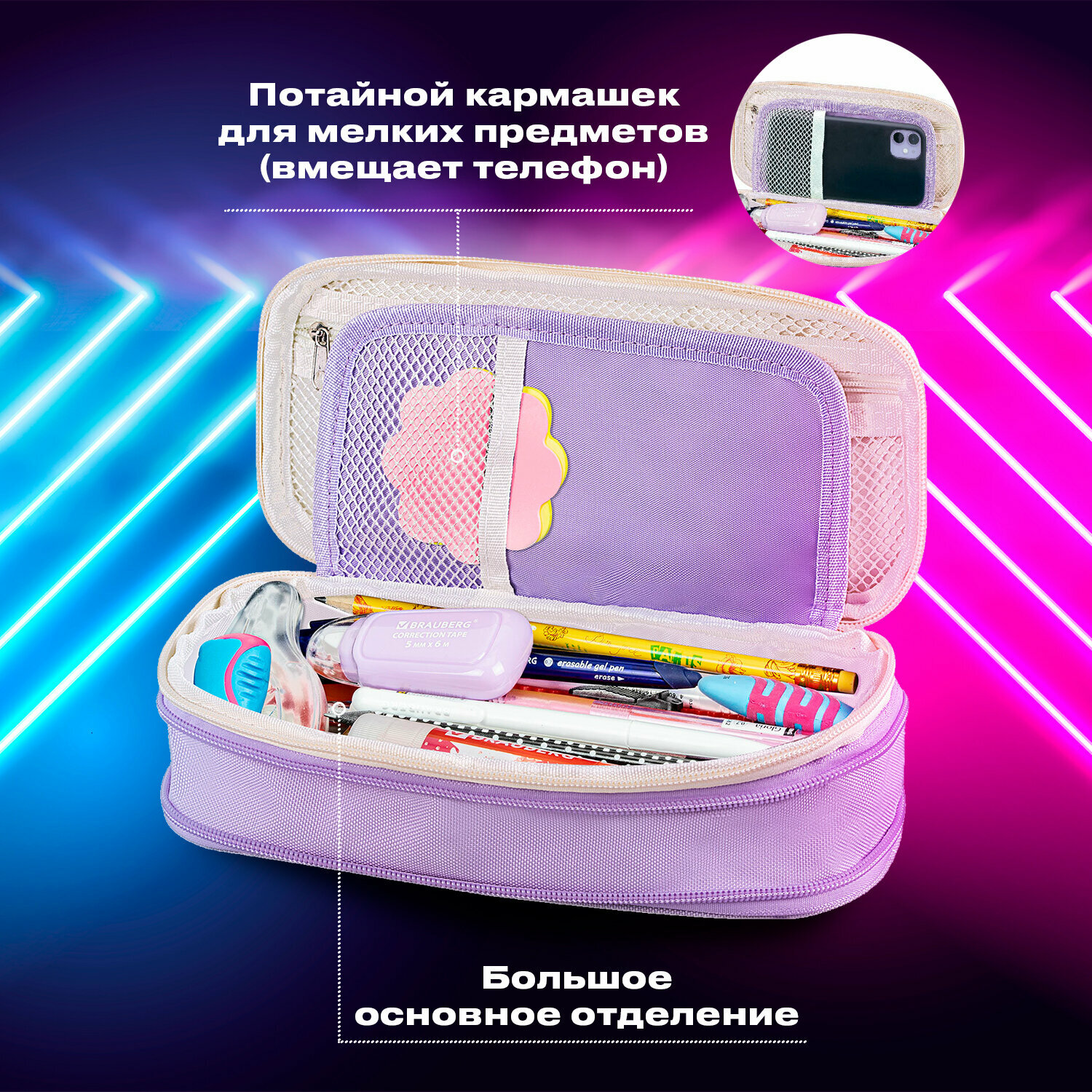Отзывы на Пенал-косметичка школьный для ручек, карандашей Brauberg, полиэстер, 23х11х5см, фиолетовый, 271562