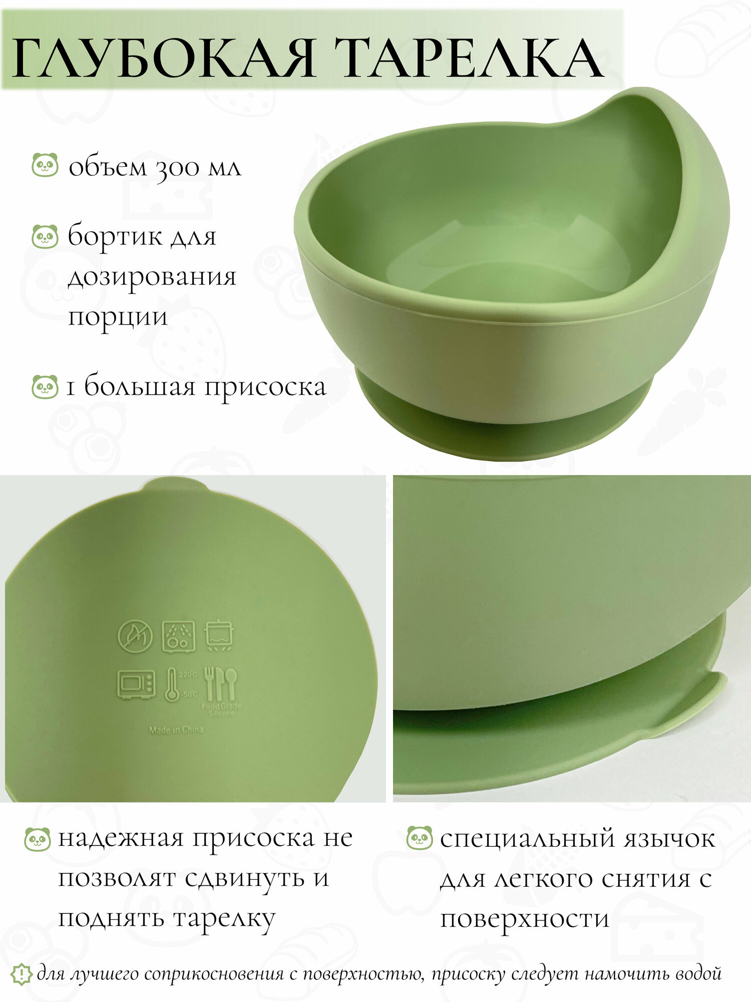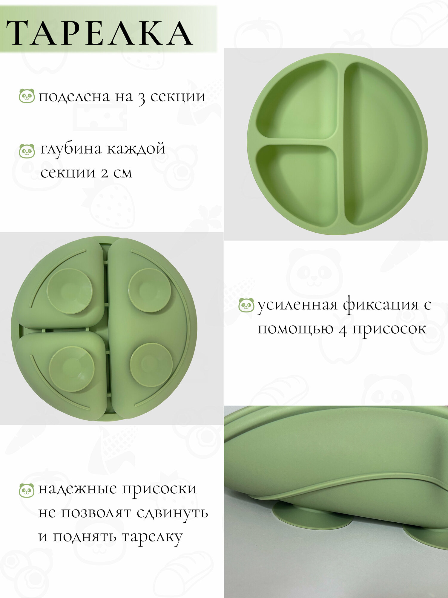 | Особенности | использование в СВЧ / можно мыть в посудомоечной машине / можно стерилизовать / на присоске / тарелка с секциями |
