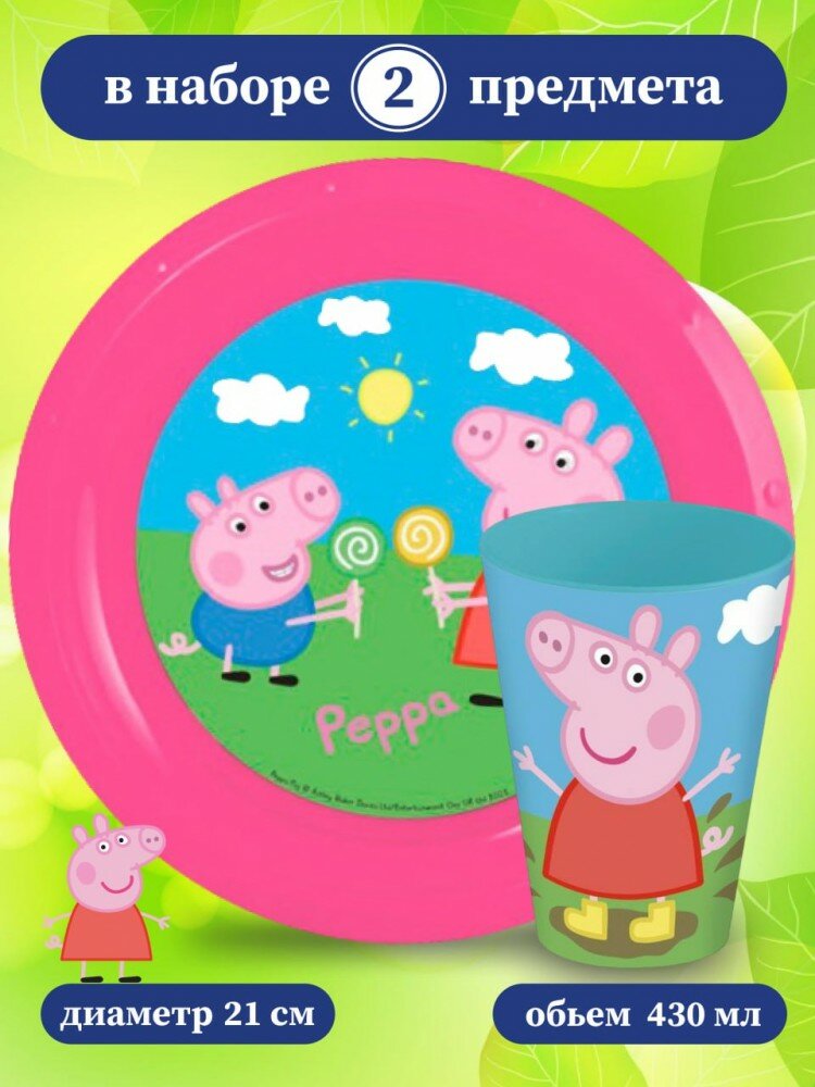 Набор пластиковой посуды Свинка Пеппа (2 предмета: стакан 430 мл + тарелка 21 см)