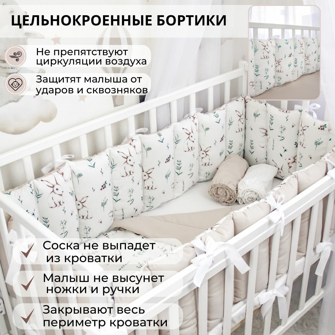 10 цен на Бортики-заборчики в кроватку для новорожденных "Зайки в поле с оборотом в цвете "лён"