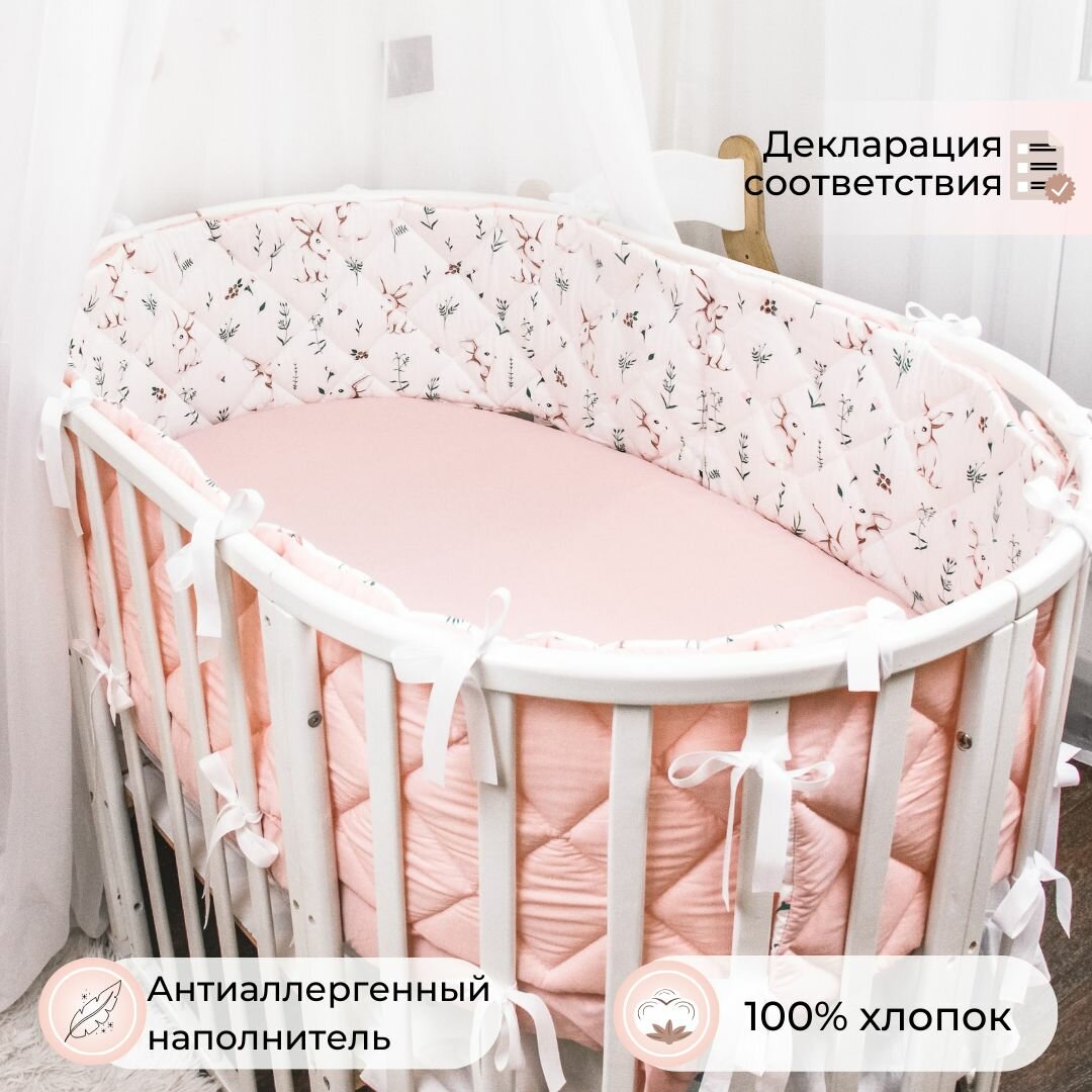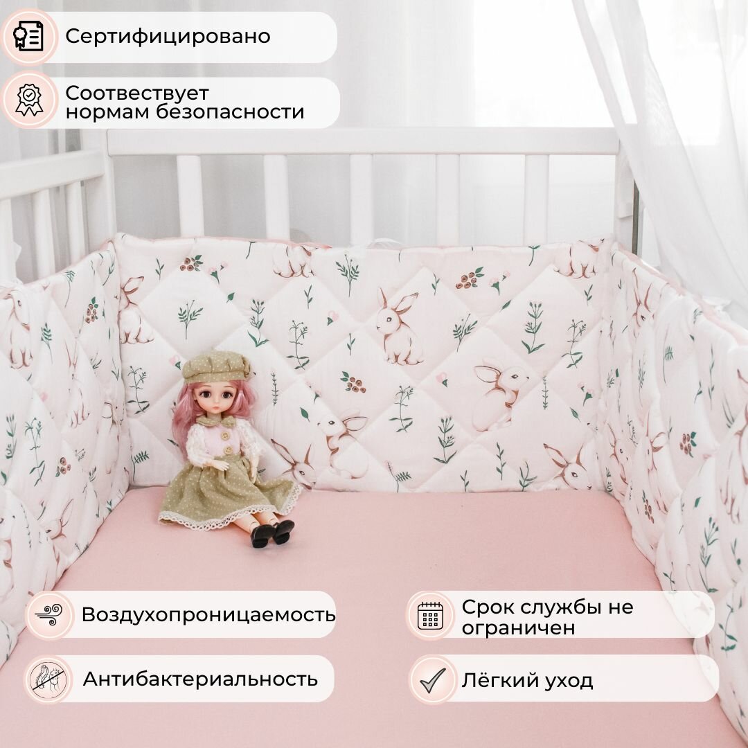 Бортики в кроватку для новорожденного "Крольчата с розовым": плоские, тонкие, стёганые 4 900 ₽
