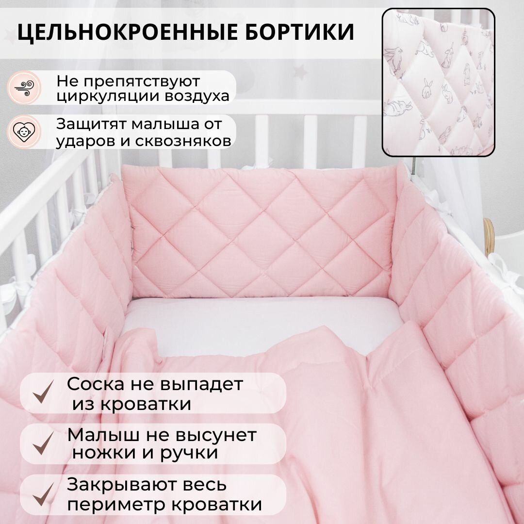 10 цен на Бортики в кроватку для новорожденного "Крольчата с розовым": плоские, тонкие, стёганые