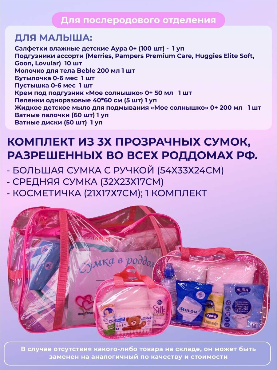 Cумка в роддом прозрачная готовая для мамы и малыша набор для беременных, комплектация "Комфортная", цвет розовый тонированный информация: