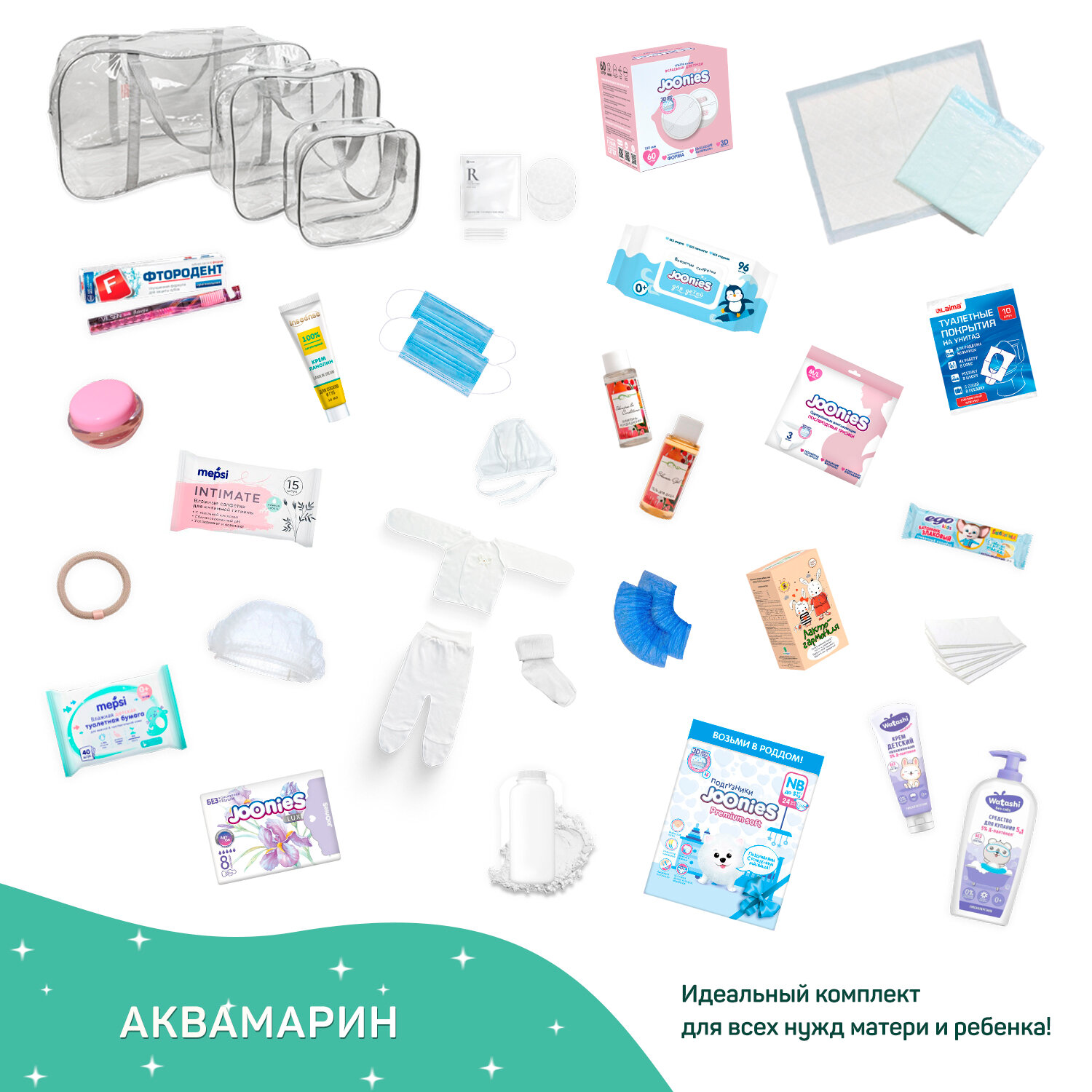 Отзывы на Сумка в роддом готовая для мамы и малыша с наполнением, 29 предметов, 3 сумки, комплектация "Аквамарин", прозрачная