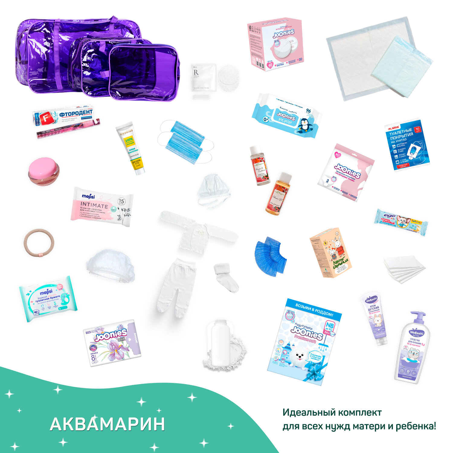 Сумка в роддом готовая для мамы и малыша с наполнением, 29 предметов, 3 сумки, комплектация "Аквамарин", прозрачная 5 622 ₽