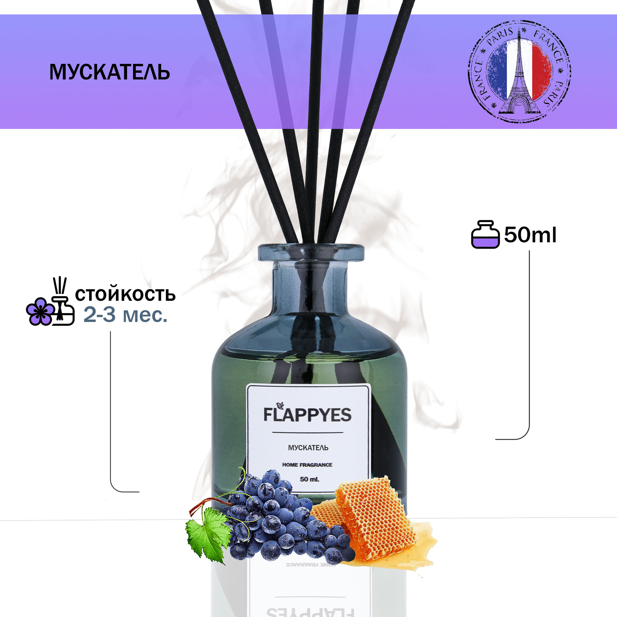 Ароматический диффузор с палочками для дома "Flappyes - Мускатель" / Ароматизатор для дома / аромадиффузор информация: