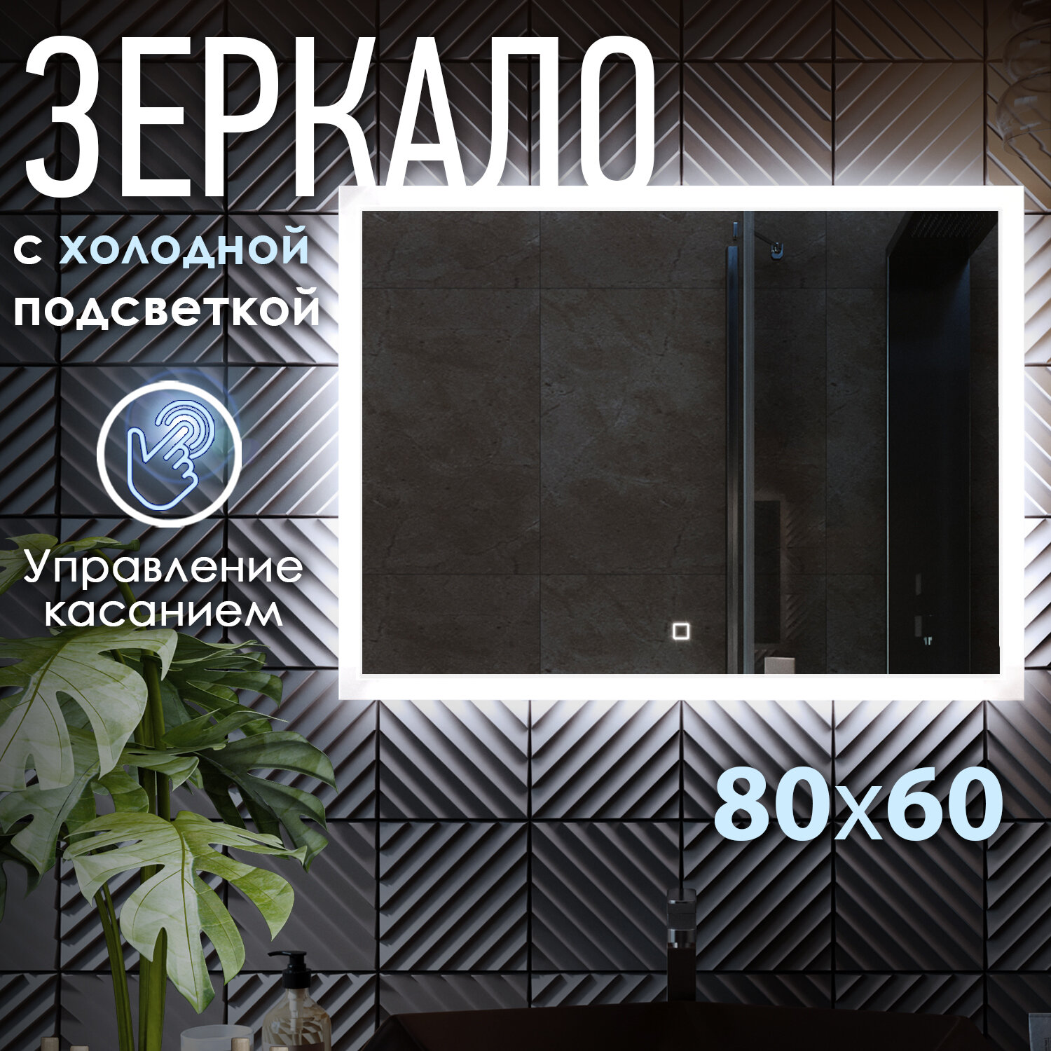 Зеркало с LED подсветкой LARO 80x60см (холодный свет 6000К, прямоугольное настенное для ванной сенсорное выключение) информация: