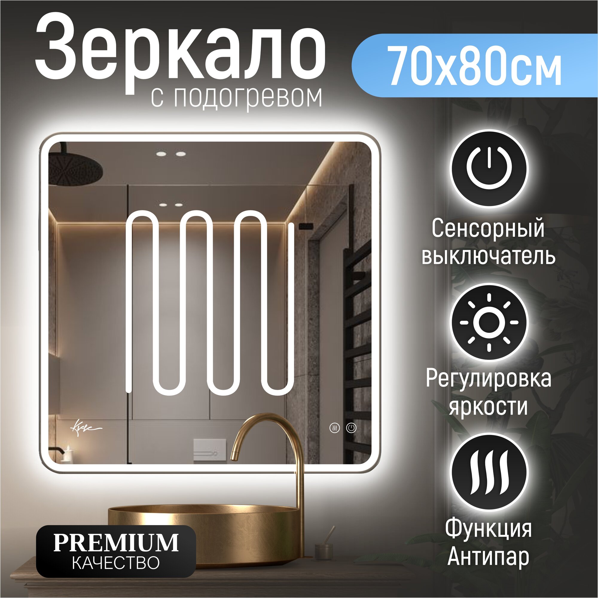 Отзывы на Зеркало в ванную Milan 70х80 см с фронтальной LED- подсветкой и подогревом (настенное, влагостойкое с сенсорным управлением, интерьерное, прямоугольное, антипар, холодная подсветка 6000К)