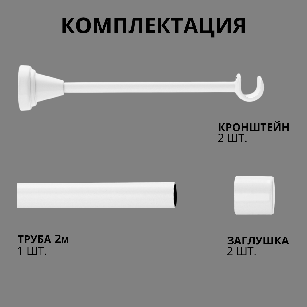 | Комплектация | труба для карниза 1,6м 2 шт, кронштейн для карниза 3 шт, наконечник для карниза заглушка 2 шт, соединитель для карниза 1 шт |