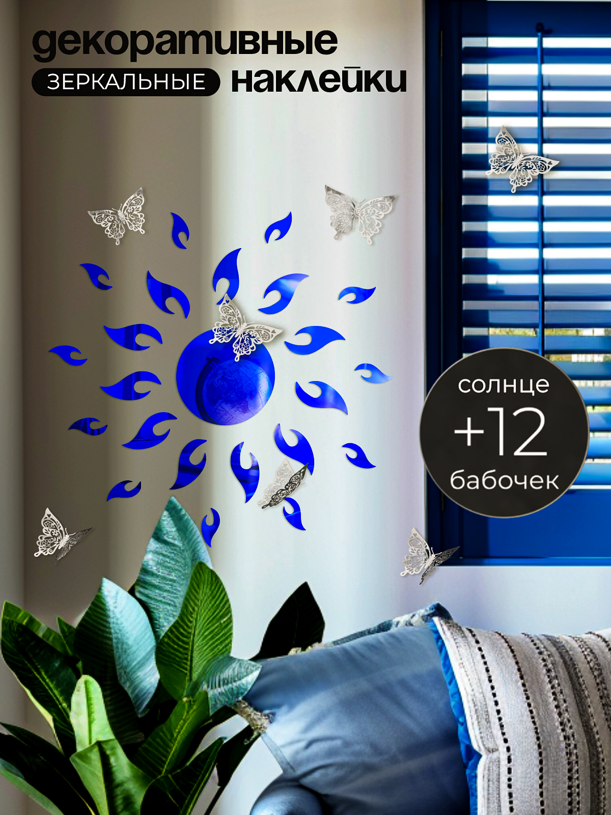 10 цен на Наклейки интерьерные зеркальные INFINITY интерьер, декор на стену солнце синее+бабочка серебро 12шт.