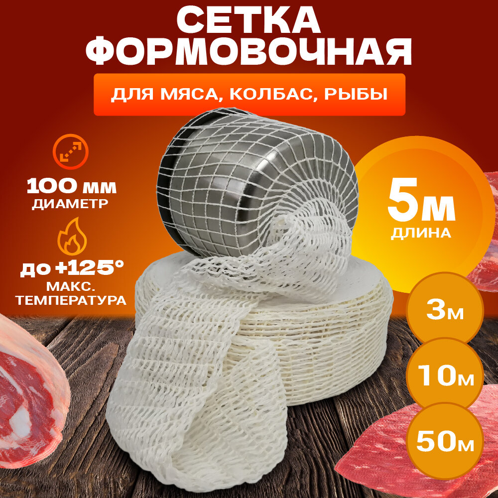 10 цен на Сетка формовочная для мяса, рулетов, рыбы (100мм, 5 метров) для копчения, запекания, варки