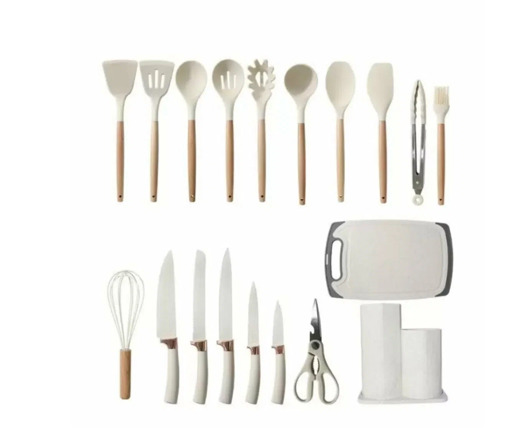 Комплектация | Щипцы кухонные, лопатка кондитерская и лопаточка с отверстиями для жарки на сковороде, ложка для спагетти, ложка для салата, ложка для выпечки, шпатель, половник, шумовка, венчик для взбивания, кисточка для масла, 5 ножей разного размера, разделочная доска и подставка для хранения приборов. |