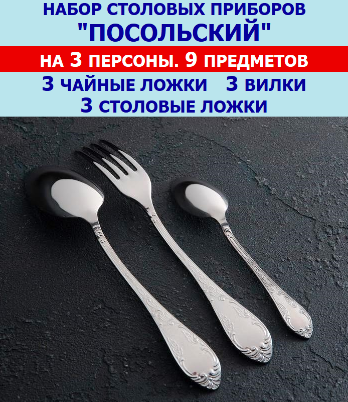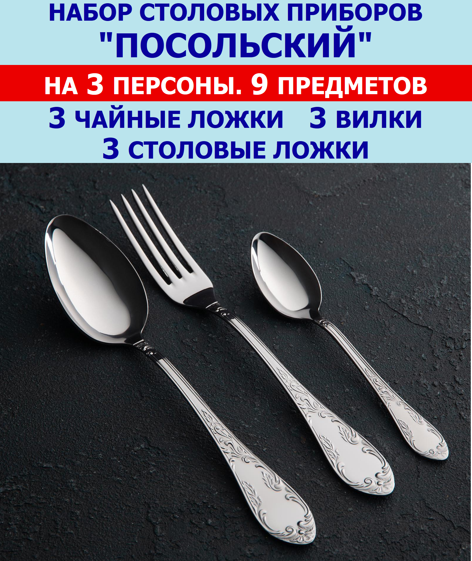 10 цен на Набор столовых приборов "Посольские" из 9 предметов на 3 персоны (ложки столовые и чайные, вилки), Павловский завод им.Кирова.