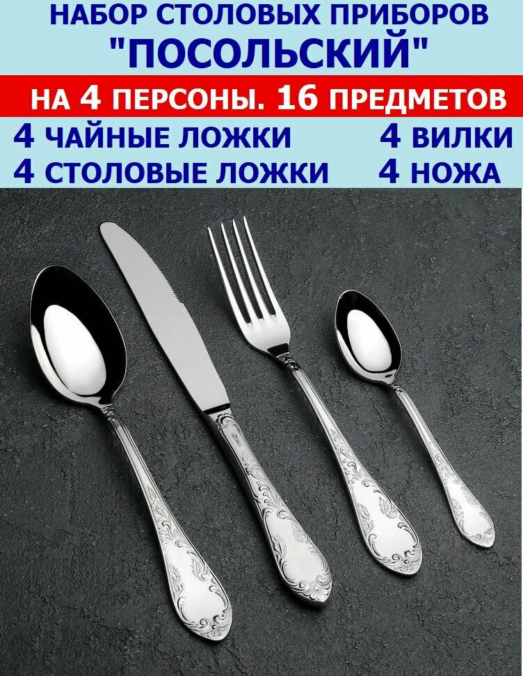 10 цен на Набор столовых приборов "Посольский" из 16 предметов на 4 персоны (ложки столовые и чайные, вилки и ножи), Павловский завод им.Кирова.